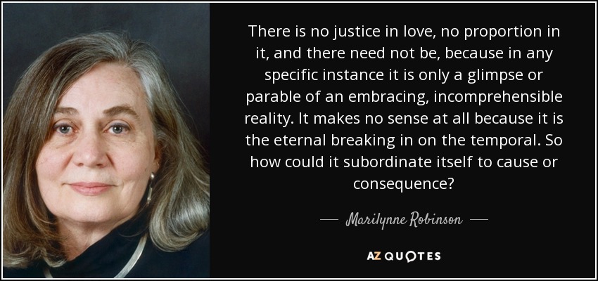 There is no justice in love, no proportion in it, and there need not be, because in any specific instance it is only a glimpse or parable of an embracing, incomprehensible reality. It makes no sense at all because it is the eternal breaking in on the temporal. So how could it subordinate itself to cause or consequence?