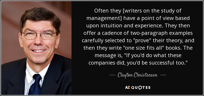 Often they [writers on the study of management] have a point of view based upon intuition and experience. They then offer a cadence of two-paragraph examples carefully selected to "prove" their theory, and then they write "one size fits all" books. The message is, "If you'd do what these companies did, you'd be successful too."