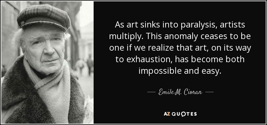 As art sinks into paralysis, artists multiply. This anomaly ceases to be one if we realize that art, on its way to exhaustion, has become both impossible and easy.