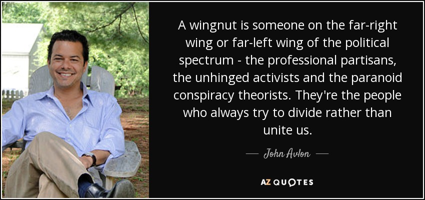 A wingnut is someone on the far-right wing or far-left wing of the political spectrum - the professional partisans, the unhinged activists and the paranoid conspiracy theorists. They're the people who always try to divide rather than unite us.