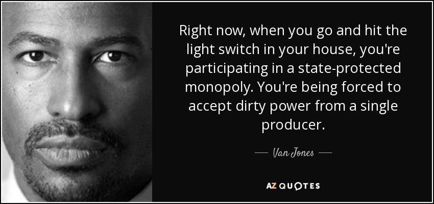 Right now, when you go and hit the light switch in your house, you're participating in a state-protected monopoly. You're being forced to accept dirty power from a single producer.