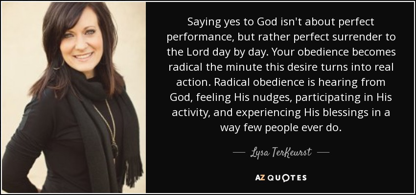 Saying yes to God isn't about perfect performance, but rather perfect surrender to the Lord day by day. Your obedience becomes radical the minute this desire turns into real action. Radical obedience is hearing from God, feeling His nudges, participating in His activity, and experiencing His blessings in a way few people ever do.