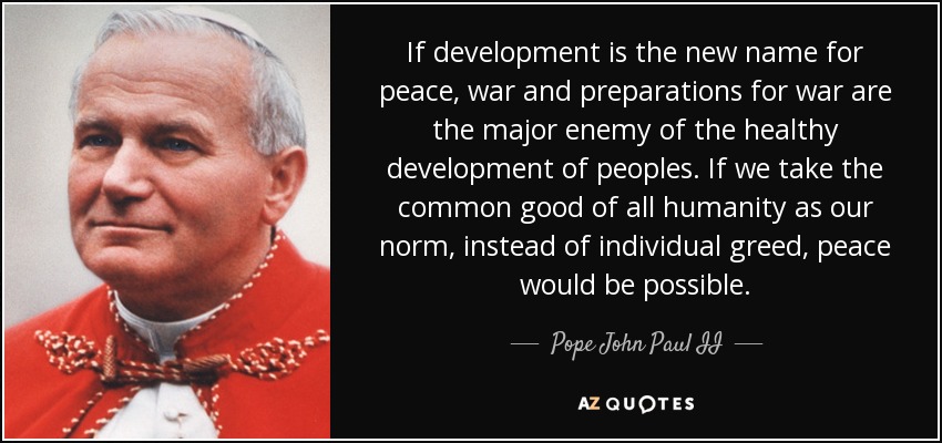 If development is the new name for peace, war and preparations for war are the major enemy of the healthy development of peoples. If we take the common good of all humanity as our norm, instead of individual greed, peace would be possible.