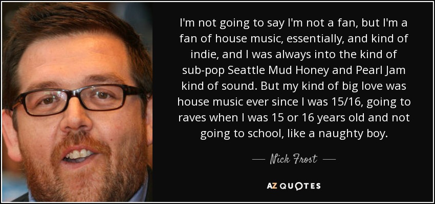 I'm not going to say I'm not a fan, but I'm a fan of house music, essentially, and kind of indie, and I was always into the kind of sub-pop Seattle Mud Honey and Pearl Jam kind of sound. But my kind of big love was house music ever since I was 15/16, going to raves when I was 15 or 16 years old and not going to school, like a naughty boy.