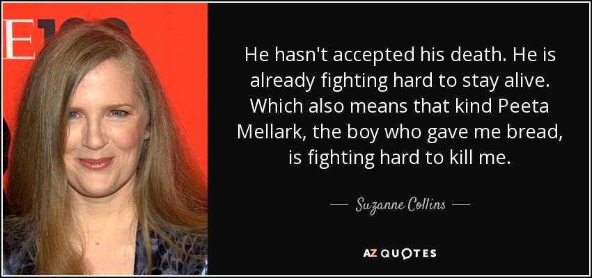 He hasn't accepted his death. He is already fighting hard to stay alive. Which also means that kind Peeta Mellark, the boy who gave me bread, is fighting hard to kill me.