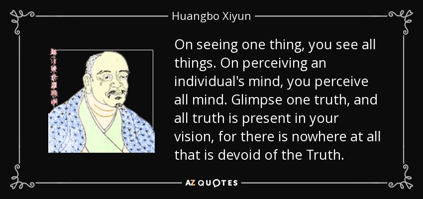 On seeing one thing, you see all things. On perceiving an individual's mind, you perceive all mind. Glimpse one truth, and all truth is present in your vision, for there is nowhere at all that is devoid of the Truth.