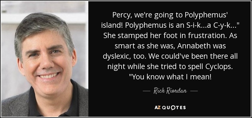 Percy, we're going to Polyphemus' island! Polyphemus is an S-i-k...a C-y-k..." She stamped her foot in frustration. As smart as she was, Annabeth was dyslexic, too. We could've been there all night while she tried to spell Cyclops. "You know what I mean!