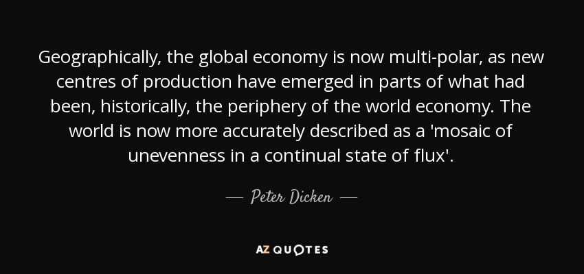 Geographically, the global economy is now multi-polar , as new centres of production have emerged in parts of what had been, historically, the periphery of the world economy. The world is now more accurately described as a 'mosaic of unevenness in a continual state of flux'.