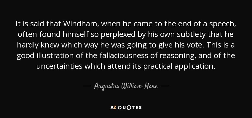 It is said that Windham, when he came to the end of a speech, often found himself so perplexed by his own subtlety that he hardly knew which way he was going to give his vote. This is a good illustration of the fallaciousness of reasoning, and of the uncertainties which attend its practical application.