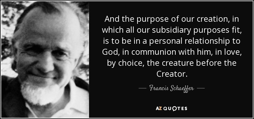 And the purpose of our creation, in which all our subsidiary purposes fit, is to be in a personal relationship to God, in communion with him, in love, by choice, the creature before the Creator.