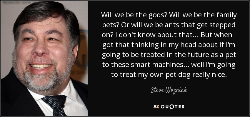 Will we be the gods? Will we be the family pets? Or will we be ants that get stepped on? I don't know about that ... But when I got that thinking in my head about if I'm going to be treated in the future as a pet to these smart machines ... well I'm going to treat my own pet dog really nice.