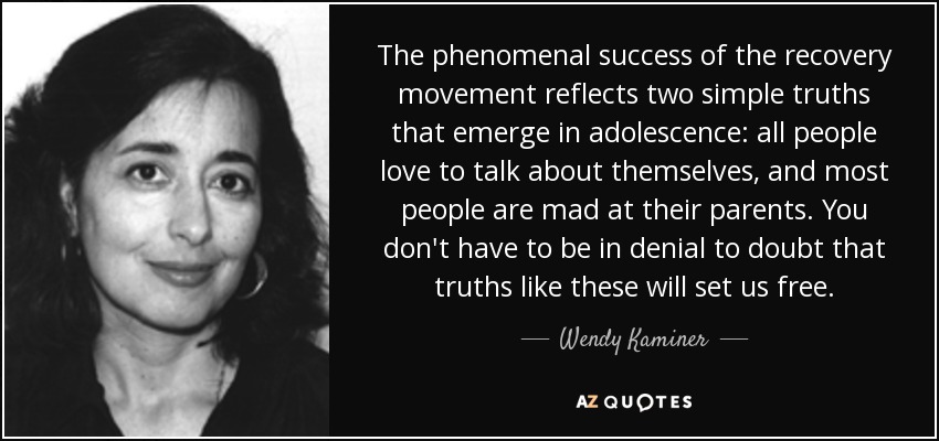 The phenomenal success of the recovery movement reflects two simple truths that emerge in adolescence: all people love to talk about themselves, and most people are mad at their parents. You don't have to be in denial to doubt that truths like these will set us free.