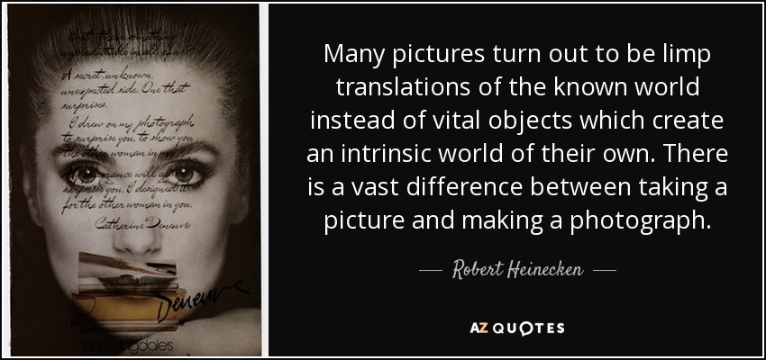 Many pictures turn out to be limp translations of the known world instead of vital objects which create an intrinsic world of their own. There is a vast difference between taking a picture and making a photograph.