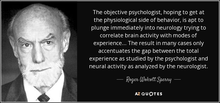 The objective psychologist, hoping to get at the physiological side of behavior, is apt to plunge immediately into neurology trying to correlate brain activity with modes of experience ... The result in many cases only accentuates the gap between the total experience as studied by the psychologist and neural activity as analyzed by the neurologist.
