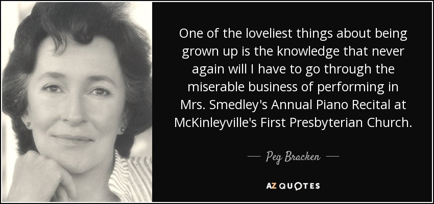 One of the loveliest things about being grown up is the knowledge that never again will I have to go through the miserable business of performing in Mrs. Smedley's Annual Piano Recital at McKinleyville's First Presbyterian Church.