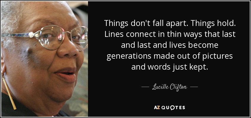 Things don't fall apart. Things hold. Lines connect in thin ways that last and last and lives become generations made out of pictures and words just kept.