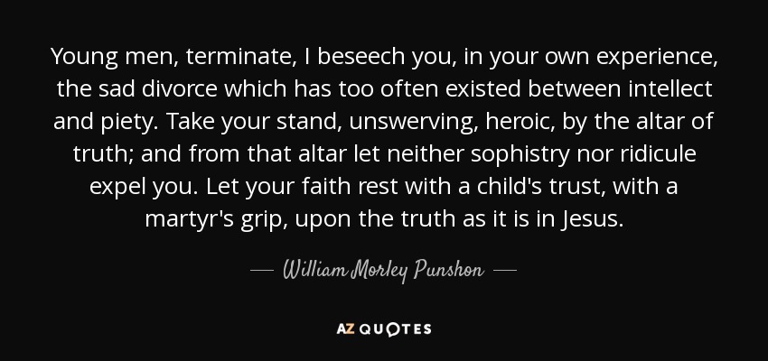 Young men, terminate, I beseech you, in your own experience, the sad divorce which has too often existed between intellect and piety. Take your stand, unswerving, heroic, by the altar of truth; and from that altar let neither sophistry nor ridicule expel you. Let your faith rest with a child's trust, with a martyr's grip, upon the truth as it is in Jesus.