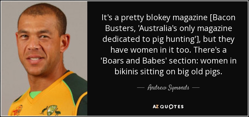 It's a pretty blokey magazine [Bacon Busters, 'Australia's only magazine dedicated to pig hunting'], but they have women in it too. There's a 'Boars and Babes' section: women in bikinis sitting on big old pigs.