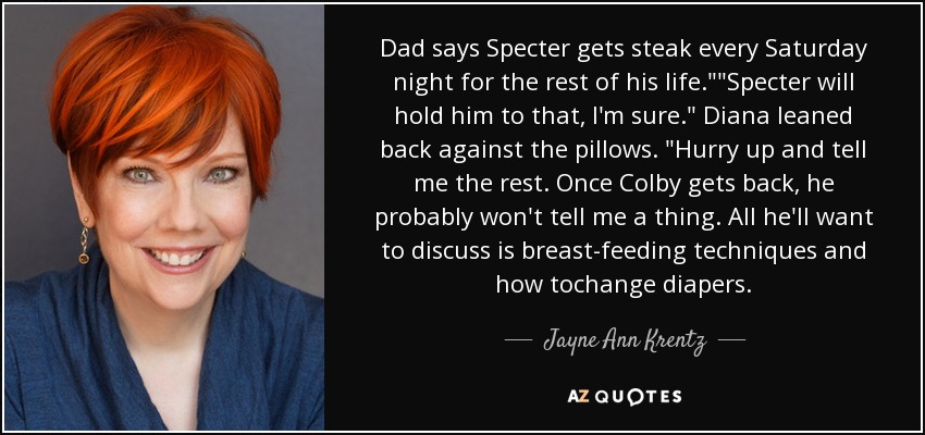 Dad says Specter gets steak every Saturday night for the rest of his life.""Specter will hold him to that, I'm sure." Diana leaned back against the pillows. "Hurry up and tell me the rest. Once Colby gets back, he probably won't tell me a thing. All he'll want to discuss is breast-feeding techniques and how tochange diapers.