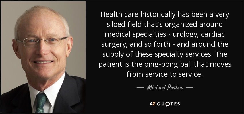 Health care historically has been a very siloed field that's organized around medical specialties - urology, cardiac surgery, and so forth - and around the supply of these specialty services. The patient is the ping-pong ball that moves from service to service.
