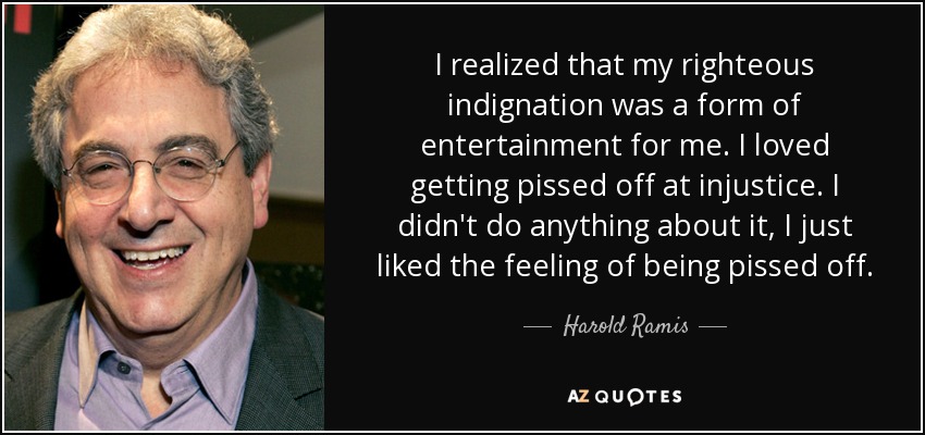 I realized that my righteous indignation was a form of entertainment for me. I loved getting pissed off at injustice. I didn't do anything about it, I just liked the feeling of being pissed off.
