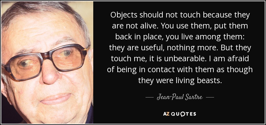 Objects should not touch because they are not alive. You use them, put them back in place, you live among them: they are useful, nothing more. But they touch me, it is unbearable. I am afraid of being in contact with them as though they were living beasts.