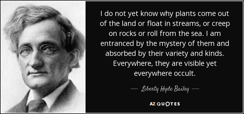 I do not yet know why plants come out of the land or float in streams, or creep on rocks or roll from the sea. I am entranced by the mystery of them and absorbed by their variety and kinds. Everywhere, they are visible yet everywhere occult.