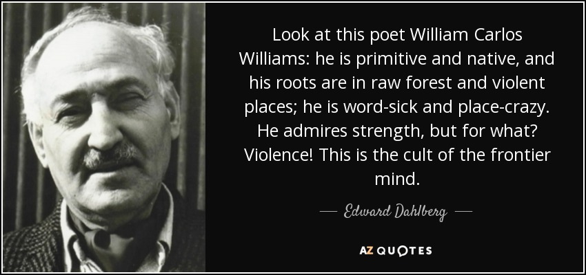 Look at this poet William Carlos Williams: he is primitive and native, and his roots are in raw forest and violent places; he is word-sick and place-crazy. He admires strength, but for what? Violence! This is the cult of the frontier mind.