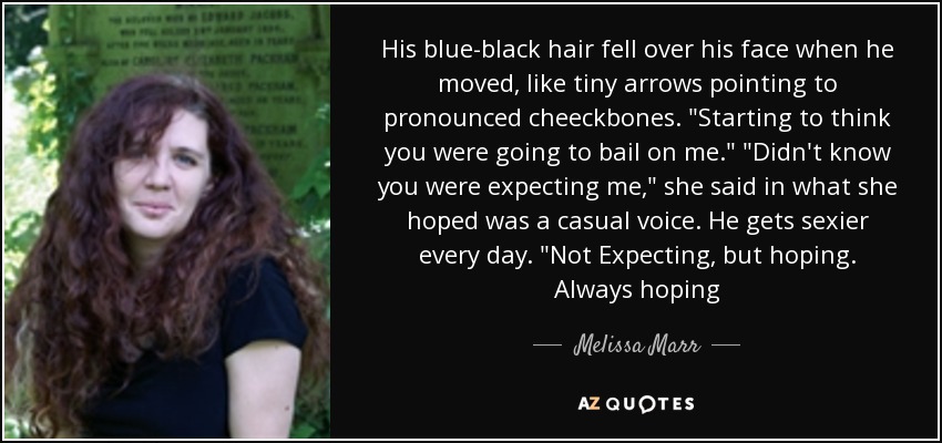 His blue-black hair fell over his face when he moved, like tiny arrows pointing to pronounced cheeckbones. "Starting to think you were going to bail on me." "Didn't know you were expecting me," she said in what she hoped was a casual voice. He gets sexier every day. "Not Expecting, but hoping. Always hoping