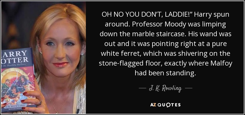 OH NO YOU DON’T, LADDIE!” Harry spun around. Professor Moody was limping down the marble staircase. His wand was out and it was pointing right at a pure white ferret, which was shivering on the stone-flagged floor, exactly where Malfoy had been standing.