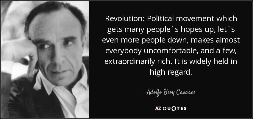 Revolution: Political movement which gets many people´s hopes up, let´s even more people down, makes almost everybody uncomfortable, and a few, extraordinarily rich. It is widely held in high regard.