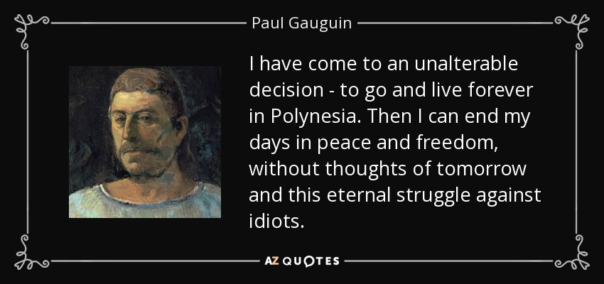 I have come to an unalterable decision - to go and live forever in Polynesia. Then I can end my days in peace and freedom, without thoughts of tomorrow and this eternal struggle against idiots.
