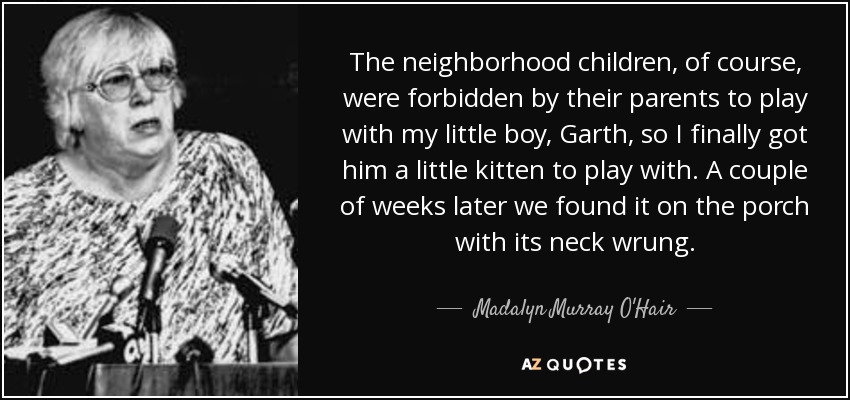 The neighborhood children, of course, were forbidden by their parents to play with my little boy, Garth, so I finally got him a little kitten to play with. A couple of weeks later we found it on the porch with its neck wrung.