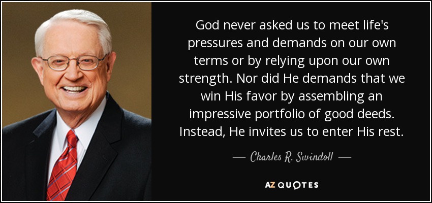 God never asked us to meet life's pressures and demands on our own terms or by relying upon our own strength. Nor did He demands that we win His favor by assembling an impressive portfolio of good deeds. Instead, He invites us to enter His rest.