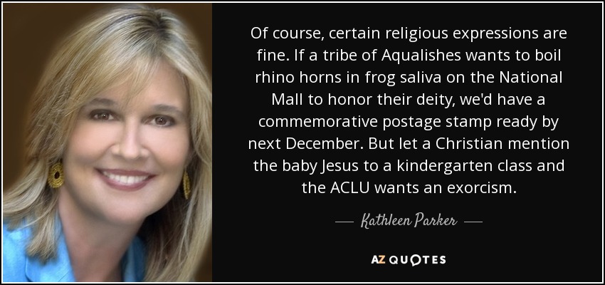 Of course, certain religious expressions are fine. If a tribe of Aqualishes wants to boil rhino horns in frog saliva on the National Mall to honor their deity, we'd have a commemorative postage stamp ready by next December. But let a Christian mention the baby Jesus to a kindergarten class and the ACLU wants an exorcism.