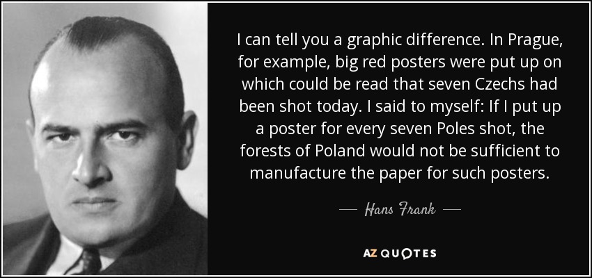 I can tell you a graphic difference. In Prague, for example, big red posters were put up on which could be read that seven Czechs had been shot today. I said to myself: If I put up a poster for every seven Poles shot, the forests of Poland would not be sufficient to manufacture the paper for such posters.