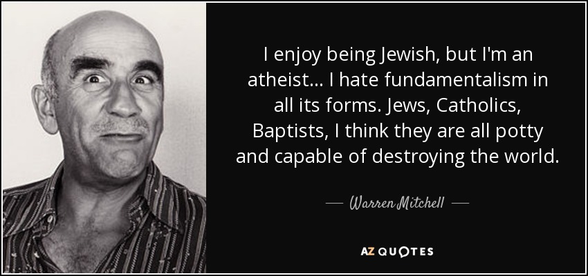 I enjoy being Jewish, but I'm an atheist... I hate fundamentalism in all its forms. Jews, Catholics, Baptists, I think they are all potty and capable of destroying the world.