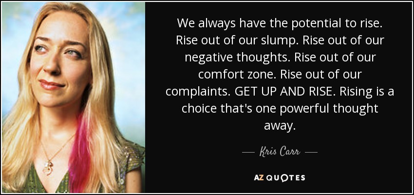 We always have the potential to rise. Rise out of our slump. Rise out of our negative thoughts. Rise out of our comfort zone. Rise out of our complaints. GET UP AND RISE. Rising is a choice that's one powerful thought away.