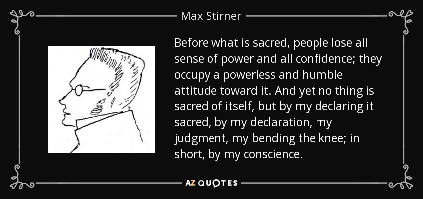 Before what is sacred, people lose all sense of power and all confidence; they occupy a powerless and humble attitude toward it. And yet no thing is sacred of itself, but by my declaring it sacred, by my declaration, my judgment, my bending the knee; in short, by my conscience.