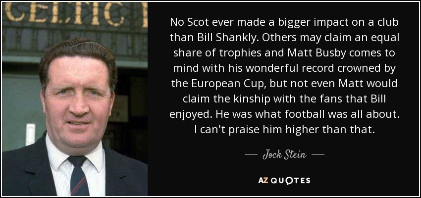 No Scot ever made a bigger impact on a club than Bill Shankly. Others may claim an equal share of trophies and Matt Busby comes to mind with his wonderful record crowned by the European Cup, but not even Matt would claim the kinship with the fans that Bill enjoyed. He was what football was all about. I can't praise him higher than that.