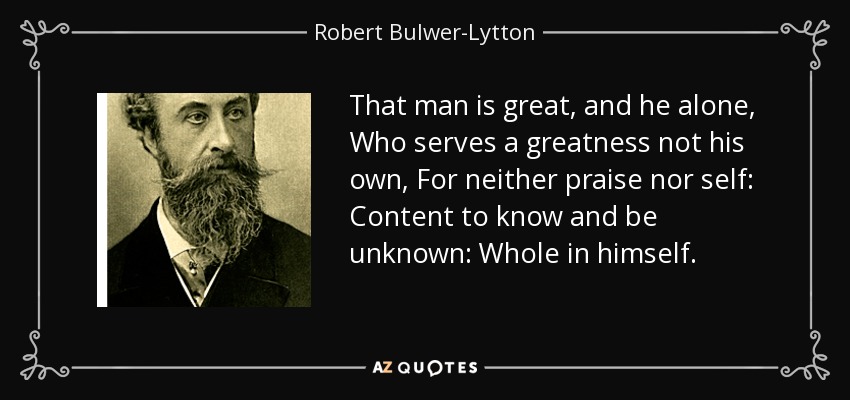 That man is great, and he alone, Who serves a greatness not his own, For neither praise nor self: Content to know and be unknown: Whole in himself.