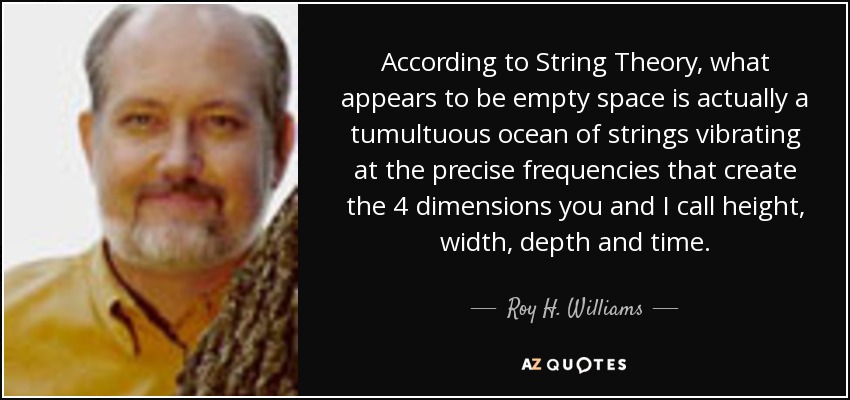 According to String Theory, what appears to be empty space is actually a tumultuous ocean of strings vibrating at the precise frequencies that create the 4 dimensions you and I call height, width, depth and time.