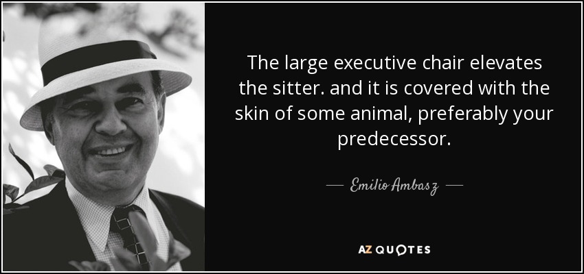 The large executive chair elevates the sitter. and it is covered with the skin of some animal, preferably your predecessor.