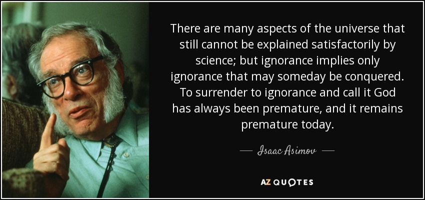 There are many aspects of the universe that still cannot be explained satisfactorily by science; but ignorance implies only ignorance that may someday be conquered. To surrender to ignorance and call it God has always been premature, and it remains premature today.