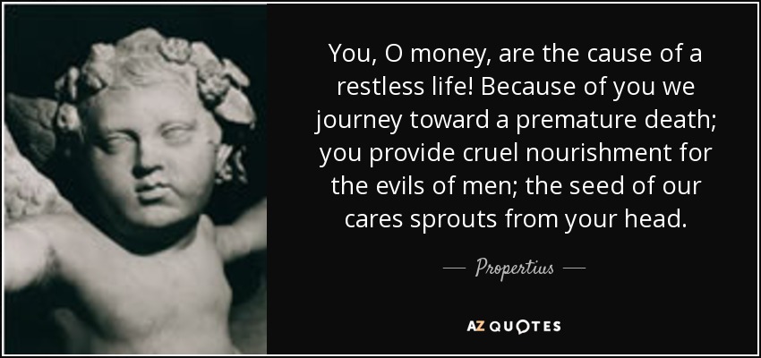 You, O money, are the cause of a restless life! Because of you we journey toward a premature death; you provide cruel nourishment for the evils of men; the seed of our cares sprouts from your head.