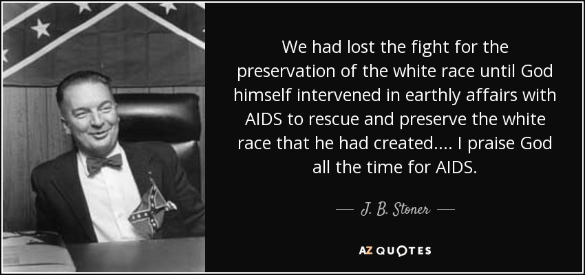 We had lost the fight for the preservation of the white race until God himself intervened in earthly affairs with AIDS to rescue and preserve the white race that he had created.... I praise God all the time for AIDS.