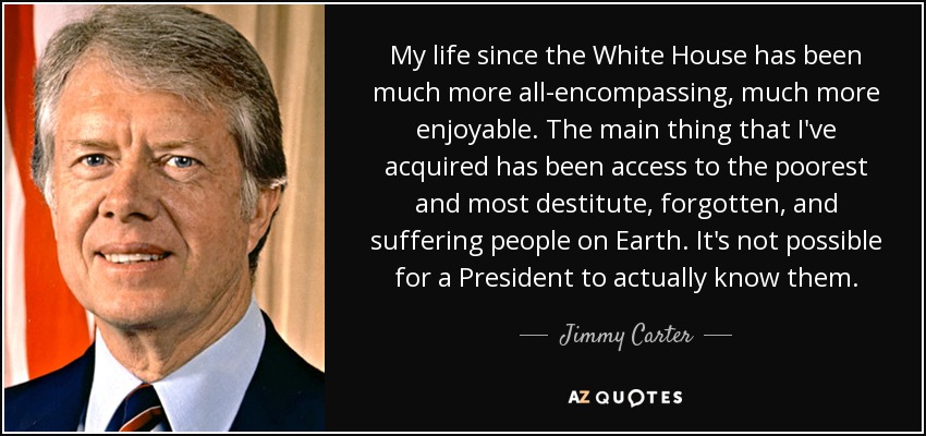 My life since the White House has been much more all-encompassing, much more enjoyable. The main thing that I've acquired has been access to the poorest and most destitute, forgotten, and suffering people on Earth. It's not possible for a President to actually know them.