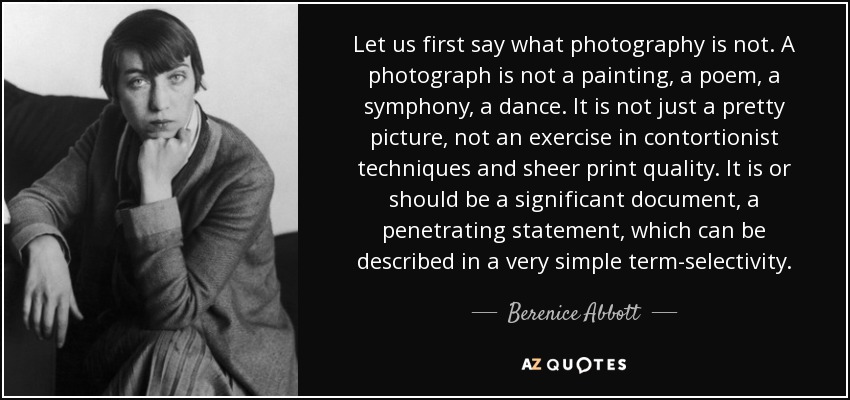 Let us first say what photography is not. A photograph is not a painting, a poem, a symphony, a dance. It is not just a pretty picture, not an exercise in contortionist techniques and sheer print quality. It is or should be a significant document, a penetrating statement, which can be described in a very simple term-selectivity.