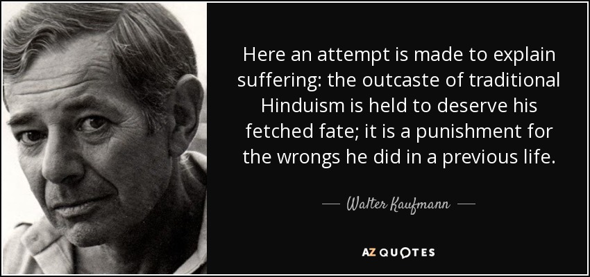 Here an attempt is made to explain suffering: the outcaste of traditional Hinduism is held to deserve his fetched fate; it is a punishment for the wrongs he did in a previous life.