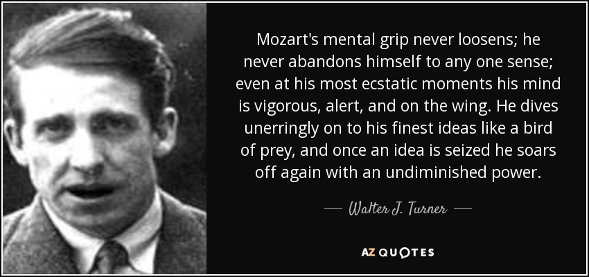 Mozart's mental grip never loosens; he never abandons himself to any one sense; even at his most ecstatic moments his mind is vigorous, alert, and on the wing. He dives unerringly on to his finest ideas like a bird of prey, and once an idea is seized he soars off again with an undiminished power.